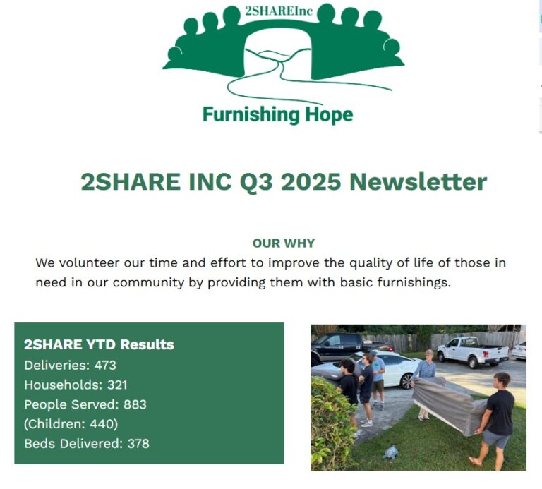 The success of 2SHARE is dependent on your furniture and cash donations. We will pick up donated items (in good condition) at no cost to you. 2SHARE then delivers, free of charge, to families in need in the Greater Wilmington area. Through your support we were able to increase pickups and deliveries by 22% in 2024.