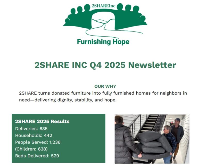The success of 2SHARE is dependent on your furniture and cash donations. We will pick up donated items (in good condition) at no cost to you. 2SHARE then delivers, free of charge, to families in need in the Greater Wilmington area. Through your support we were able to increase pickups and deliveries by 100% in 2025.